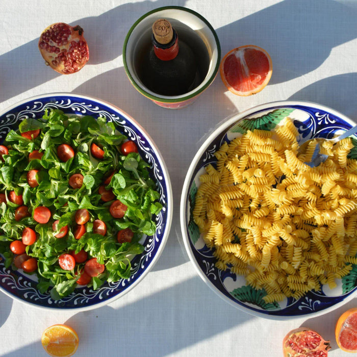 Voeg een vleugje Mediterrane charme toe aan je eettafel met de Serveerschaal Flor Azul 37,5 cm. Deze prachtige, handgemaakte schaal uit Spanje is een echte eyecatcher voor elke gelegenheid – van een uitgebreid diner met vrienden tot een ontspannen ontbijt voor twee. Met zijn levendige blauwe tinten en elegante patroon presenteer je jouw gerechten alsof ze zo uit een kookmagazine komen. Perfect om salades, tapas of vers fruit in te serveren, en wanneer hij leeg is, steelt hij ook als decoratief stuk in je keuken de show. Elk exemplaar is uniek, met de hand gemaakt en net even anders, wat betekent dat je meer dan een schaal koopt – je haalt een stukje authentiek vakmanschap in huis. Bovendien is hij groot genoeg om al je culinaire creaties royaal te presenteren, maar compact genoeg om makkelijk op te bergen. Deze schaal combineert moeiteloos stijl en functionaliteit, en als je wilt variëren, zijn er nog zes andere ontwerpen om mee te mixen en matchen. Maak van elke maaltijd een feestje en laat jouw tafel stralen met de Flor Azul serveerschaal!