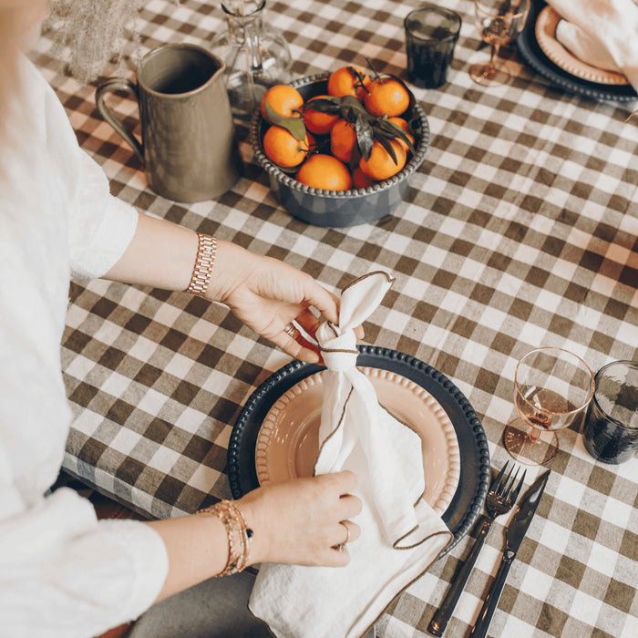 Zoek je iets speciaals om je tafelschikking op te fleuren? Deze mooie Mimi servetten van Maison de Vacances bieden een vleugje elegantie en verfijning. Gemaakt in Frankrijk van een linnen en katoenmix zijn deze servetten geweven met tweekleurig geverfd garen voor een mooie, unieke look. Plus, de kaki rand voegt een vleugje verfijning toe. Of je nu gasten ontvangt voor een speciale gelegenheid of gewoon je dagelijkse eetervaring wilt opwaarderen, deze servetten zullen zeker indruk maken. Dus dek de tafel en geniet!