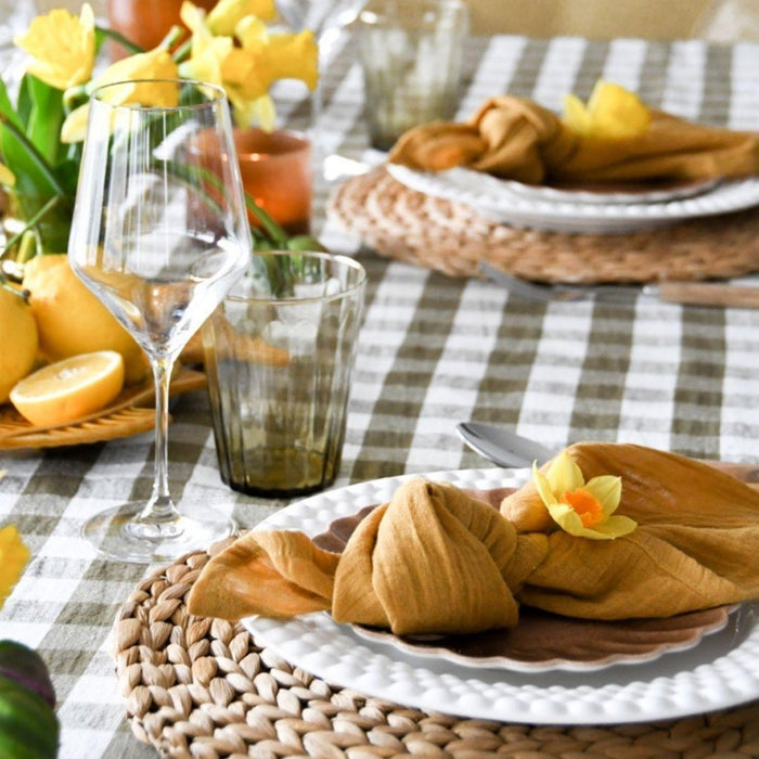Maak kennis met het Tafelkleed Bourdon Canvas Mimi Vichy - Vichy Kaki Bourdon Noir 145x350cm, een prachtig tafelkleed uit Frankrijk dat zeker een vleugje elegantie toevoegt aan elke omgeving. Dit prachtige tafelkleed is gemaakt van een 52% linnen en 48% katoenmix, en is geweven met tweekleurig geverfd garen om zijn unieke look te creëren. Het tafelkleed heeft een prachtig kaki motief met zwart rand, dat een vleugje Franse flair toevoegt aan dit toch al schitterende tafelkleed. Of je nu een etentje organiseert of gewoon een vleugje luxe aan je dagelijkse eetervaring wilt toevoegen, het tafelkleed Bourdon Canvas Mimi Vichy is het perfecte tafelkleed voor elke gelegenheid.