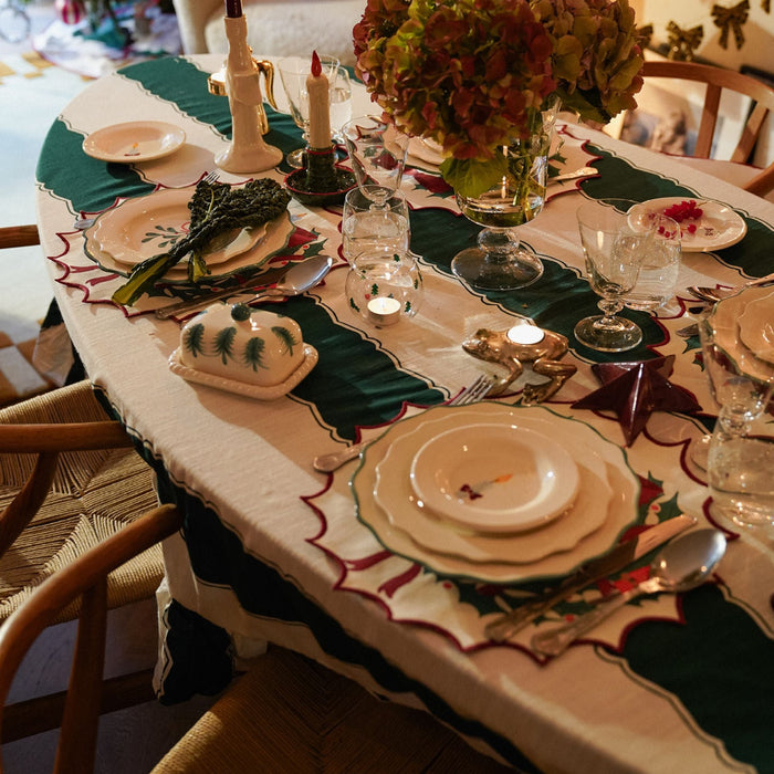 Maak van elke maaltijd een feestje met ons Tafelkleed Forest Ruffle. Dit tafelzeil is de perfecte basis voor een onvergetelijk diner met vrienden of een gezellige zondagse brunch met familie. De speelse combinatie van groene en witte strepen, samen met de elegante ruches aan de rand, geeft jouw eettafel direct een unieke en stijlvolle uitstraling. Je zult zien, dit linnen voegt net dat beetje extra flair toe waar je naar op zoek was. Gemaakt van 100% biologisch katoen, voelt dit kleed niet alleen zacht en luxueus aan, maar is het ook een duurzame keuze. Met een afmeting van 155x255 cm past het prachtig op de meeste eettafels, klaar om bewonderd te worden door je gasten. En mocht er iets geknoeid worden? Geen probleem. Je wast het gewoon op 30 graden met vergelijkbare kleuren. Volg de wasinstructies om het tafeltextiel mooi te houden: niet bleken, niet in de droger, niet chemisch reinigen en strijken op een lage temperatuur. Zo geniet je keer op keer van een prachtig gedekte tafel.