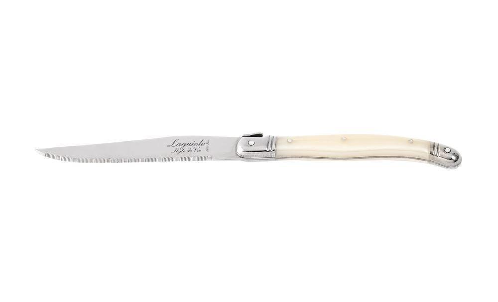 Is er iets teleurstellender dan een glansloos steakmes? Een mes dat te slap is om door vlees te snijden, groeven in het handvat die vet en vuil opvangen, hout dat krom trekt onder de hitte van de vaatwasser... Je steakmessen moeten de taak aankunnen, en onze Premium Line steakmessen doen dat. Elk mes in deze set van 6 is gemaakt van roestvrij staal met een parelmoer handvat, met een gekarteld lemmet dat zelfs de dikste stukken vlees aankan. Het lemmet is 1,8 mm dik en vaatwasmachinebestendig, zodat je je geen zorgen hoeft te maken over extra onderhoud. En elk mes wordt geleverd in zijn eigen houten blok, zodat je je steakmessen georganiseerd en chique op je aanrecht kunt bewaren. Geen fan van parelmoer? Geen probleem! Deze 6-delige steakmessen zijn ook verkrijgbaar in vele andere kleuren en materialen. Dus of je nu op zoek bent naar een klassieke parelmoer afwerking of iets moderners, bij ons zit je goed. Wat je stijl ook is, deze messen zorgen ervoor dat je volgende etentje er een is om nooit te vergeten.