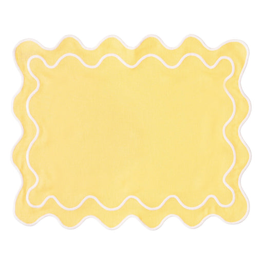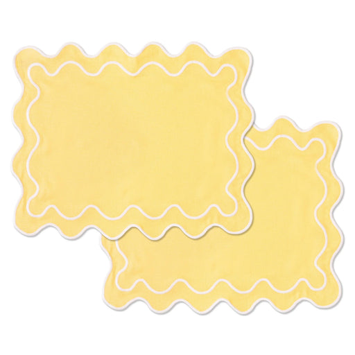 Alle Daten anzeigenBeschrijving en uitlegVoeg een vleugje verfijning toe aan jouw eettafel met deze unieke gele placemats met golvende snit en contrasterend wit bordu...