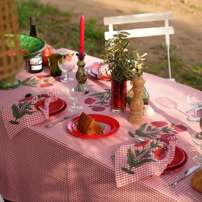 Geef je tafel een vleugje charme met het Tafelkleed Fabry Tomato 170x300cm, een prachtig geweven katoenen tafelkleed dat elke maaltijd bijzonder maakt. Het centrale bloemendessin, zorgvuldig tot leven gebracht met de eeuwenoude blockprint-techniek, straalt een tijdloze elegantie uit. Met zijn warme tomaatrode tint voegt dit kleed niet alleen kleur toe aan je tafeldecoratie, maar creëert het ook een uitnodigende sfeer waar je gasten zich meteen thuis voelen. Het 100% katoenen materiaal voelt stevig én zacht aan, perfect voor dagelijks gebruik of een speciaal etentje. Makkelijk te onderhouden, want je wast het gewoon op 30°C met een mild wasmiddel. En waarom niet de zon zijn werk laten doen door het buiten aan de lijn te drogen? Laat dit tafelkleed de basis vormen voor al je mooie tafelcreaties en herinneringen.