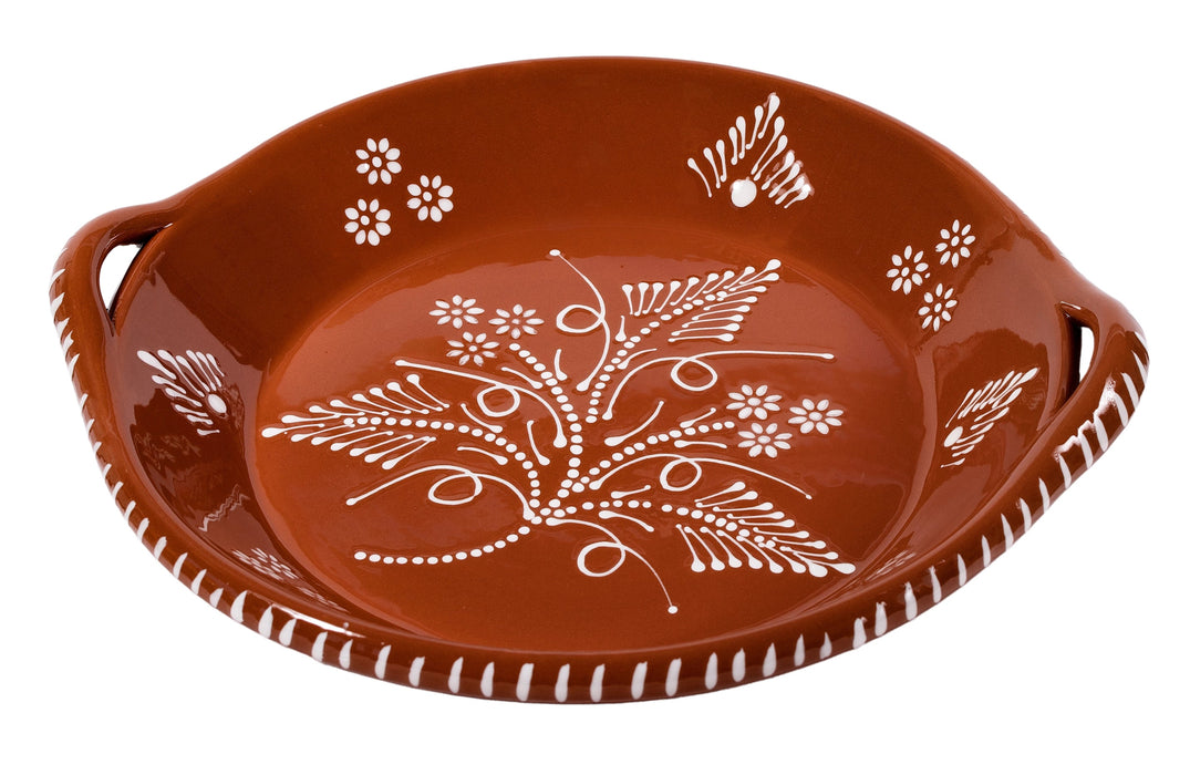 Deze prachtige terracotta schaal met handvatten, 16x16 cm, is een echte blikvanger voor jouw tafel. Handgemaakt in Portugal en met zorg handbeschilderd in een verfijnd wit motief, straalt deze aardewerken schaal authenticiteit en ambacht uit. Perfect om je favoriete gerechten op een stijlvolle manier te presenteren, of het nu gaat om een zomerse salade, knapperig vers brood, of mandarijnen uit de markt. Het formaat is ideaal voor zowel dagelijks gebruik als bijzondere gelegenheden, en door de handgeschilderde details voelt elke schaal uniek aan. Houd er wel rekening mee dat handwas wordt aanbevolen om de schoonheid van het handwerk te behouden. Voeg een vleugje Portugese elegantie en warmte toe aan jouw interieur en geniet van een tijdloos stuk dat charme en functionaliteit samenbrengt.