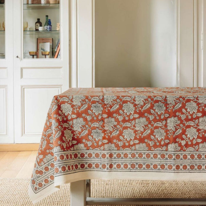 Breng je eettafel tot leven met het Rang katoenen tafelkleed van 170x300cm. Dit heldere en vrolijke tafeltextiel, met zijn levendige bloemenpatroon, is de perfecte manier om een kleurrijke, boheemse sfeer in huis te halen. Vervaardigd uit 100% katoen, voelt dit laken niet alleen zacht aan, maar is het ook een duurzame keuze voor elke gelegenheid. Maak de look compleet door het te combineren met onze bijpassende placemats en servetten voor een harmonieus geheel. Elk tafelkleed is uniek, met een eigen gevoel en karakteristieke onregelmatigheden die voortkomen uit het ambachtelijke handwerk. De handmatige druktechniek kan kleine imperfecties vertonen, wat juist getuigt van de zorg en aandacht die aan elk stuk is besteed. Dit maakt jouw tafellaken een exclusief item dat een persoonlijk en authentiek verhaal vertelt. Voor het beste onderhoud raden we aan het kleed op 30°C te wassen en het liggend aan de lucht te laten drogen. Zo geniet je keer op keer van een prachtig gedekte tafel die klaar is voor nieuwe herinneringen.