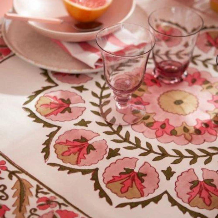 Ontdek de charme van handwerk met de Tafelkleed Rosette Rose, waarmee elke tafel een verhaal vertelt. Dit plaatje van een tafelkleed, in romantische rozetinten, is het resultaat van liefdevolle aandacht voor detail en vakmanschap. Het 100% katoenen tafelkleed is zorgvuldig versierd dankzij de block print techniek. Elk stuk stof wordt met de hand bedrukt, waardoor een complexe en tijdrovende traditie voortleeft in jouw eetkamer. Laat je verrassen door de unieke patronen omdat geen twee precies hetzelfde zijn. Variaties in kleur en kleine eigenaardigheden? Die omarmen we vol enthousiasme als tekenen van pure handgemaakte perfectie. Geef jouw dinertafel een extra persoonlijke toets met de Rosette Rose tafelkleed, waar de kleur Rose centraal staat en de grootte van 150 x 250 cm genoeg ruimte biedt voor gezellige etentjes en langdurige gesprekken. Voor de verzorging adviseer ik je een zachte machinewas op 40°. Om het zo prachtig mogelijk te houden, sla het drogen in de droogtrommel over en vermijd direct zonlicht. Laat je tafel stralen met dit stijlvolle en elegant handgemaakte gesprekstuk – een echte must-have voor iedereen die van een beetje schoonheid houdt bij het hosten van memorabele momenten.