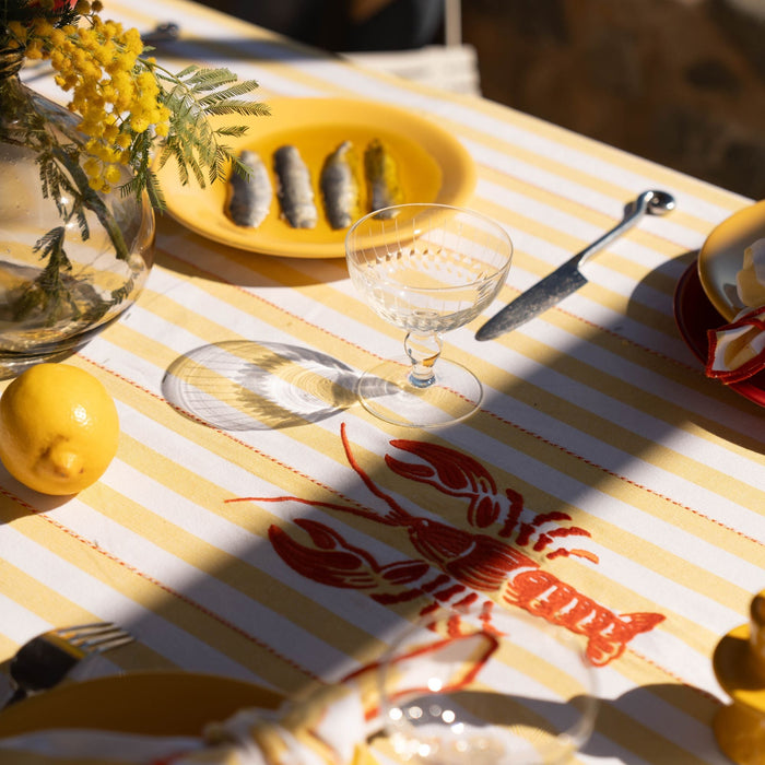 Met de Tafelkleed Magritte Geel 170x300cm breng je direct een vleugje flair en verfijning naar jouw eettafel. Dit prachtige tafellaken, geweven uit 100% hoogwaardig katoen, voelt niet alleen luxe aan, maar vertelt ook verhalen dankzij de delicate borduursels van homards, oesters en citroenen. Het zonnige gele kleurenschema geeft elke maaltijd een zomerse gloed, of je nu een casual brunch in de tuin organiseert of een chique diner binnen viert. Verzorging is een fluitje van een cent—een wasbeurt op 40°C met een zacht wasmiddel volstaat, en als het weer het toelaat, kun je het heerlijk fris laten drogen in de buitenlucht. Wie zegt dat functionele stoffen niet ook artistiek kunnen zijn? Laat jouw tafel schitteren met deze unieke combinatie van praktisch gemak en gastronomische inspiratie.