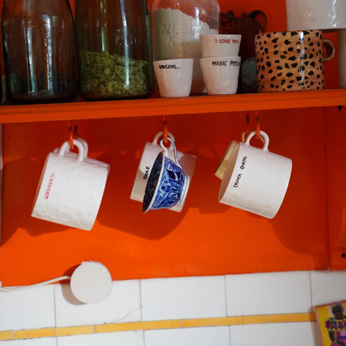 Ben jij ook zo'n persoon die 's ochtends liever niemand wil zien of spreken voordat je eerste kop koffie op is? Dan is de Mok Fuck It 500ml jouw nieuwe beste vriend! Deze keramieke beker spreekt boekdelen zonder dat jij ook maar één woord hoeft te zeggen - perfect voor alle koffieliefhebbers die hun ochtendritueel serieus nemen. Met zijn stoere statement zorgt deze handgemaakte mok ervoor dat collega's, huisgenoten en vroege vogels je eindelijk met rust laten tijdens die cruciale eerste uren van de dag. De robuuste keramiek houdt je koffie lekker warm terwijl jij langzaam tot leven komt, en dankzij het royale formaat van 500ml kun je genoeg cafeïne tanken om de wereld weer aan te kunnen. Na gebruik gooi je hem gewoon in de vaatwasser - zo simpel is dat. Combineer deze brutale beker met andere stuks uit dezelfde collectie voor een compleet koffie-statement in jouw keuken. Of je nu thuis werkt, op kantoor zit of gewoon lekker lui op de bank hangt, deze mok maakt meteen duidelijk waar jouw prioriteiten liggen: eerst koffie, dan de rest van de wereld. Een perfecte toevoeging aan jouw ochtendroutine en een geweldig cadeau voor alle medekoffieverslaafden in jouw omgeving die ook hun grenzen durven aan te geven.