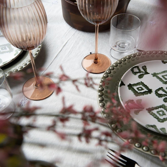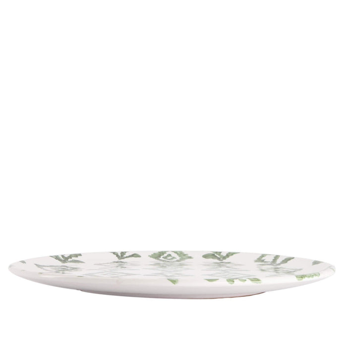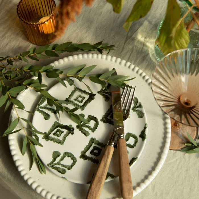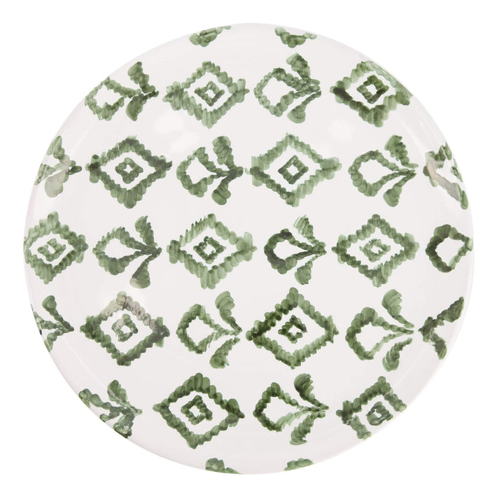 Dit ontbijtbord van 21cm doorsnede met ruitpatroon in wit groene kleur met gladde rand is een uniek en enig in zijn soort stuk dat persoonlijkheid zal toevoegen aan elke tafelsetting. De prachtige kleuren en het ingewikkelde ontwerp zijn met de hand geschilderd door bekwame ambachtslieden in Italië, waardoor elk bord een waar kunstwerk is. Of je nu een vleugje elegantie aan je eetkamer wilt toevoegen of iets bijzonders wilt voor je volgende etentje, dit bord zal zeker indruk maken.