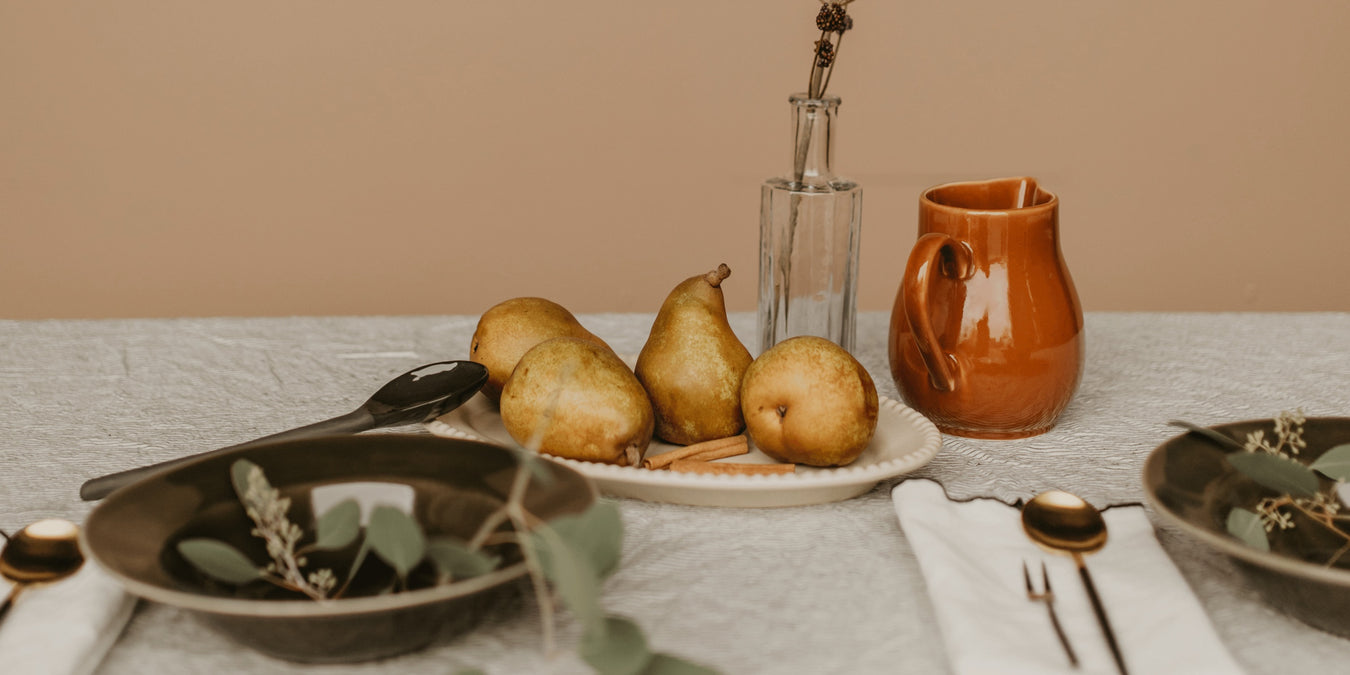 Robuuste designs, natuurlijke materialen en rustige kleuren. Met heel eigenwijs een kleuraccent hier en daar op tafel.