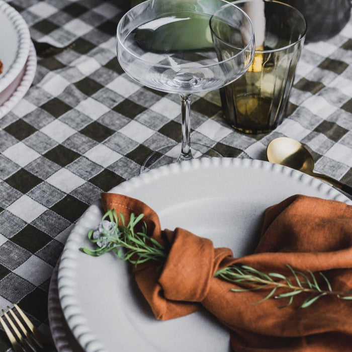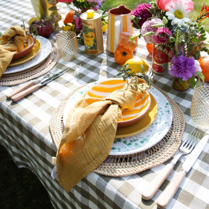 Maak kennis met het Tafelkleed Bourdon Canvas Mimi Vichy - Vichy Kaki Bourdon Noir 145x350cm, een prachtig tafelkleed uit Frankrijk dat zeker een vleugje elegantie toevoegt aan elke omgeving. Dit prachtige tafelkleed is gemaakt van een 52% linnen en 48% katoenmix, en is geweven met tweekleurig geverfd garen om zijn unieke look te creëren. Het tafelkleed heeft een prachtig kaki motief met zwart rand, dat een vleugje Franse flair toevoegt aan dit toch al schitterende tafelkleed. Of je nu een etentje organiseert of gewoon een vleugje luxe aan je dagelijkse eetervaring wilt toevoegen, het tafelkleed Bourdon Canvas Mimi Vichy is het perfecte tafelkleed voor elke gelegenheid.